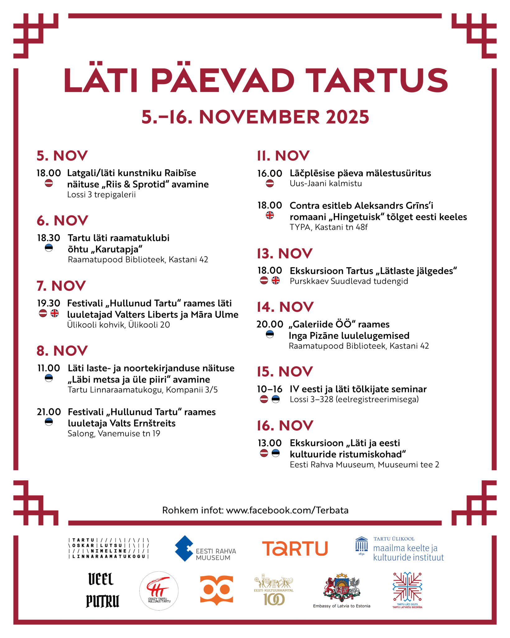 Ноябрь — особый месяц для латышей, поэтому Общество латышей Тарту вновь приглашает всех латышей, проживающих в Эстонии и Латвии, а также жителей Тарту и других городов принять участие в мероприятиях, которые помогут лучше осознать общие черты нашей истории и культуры.