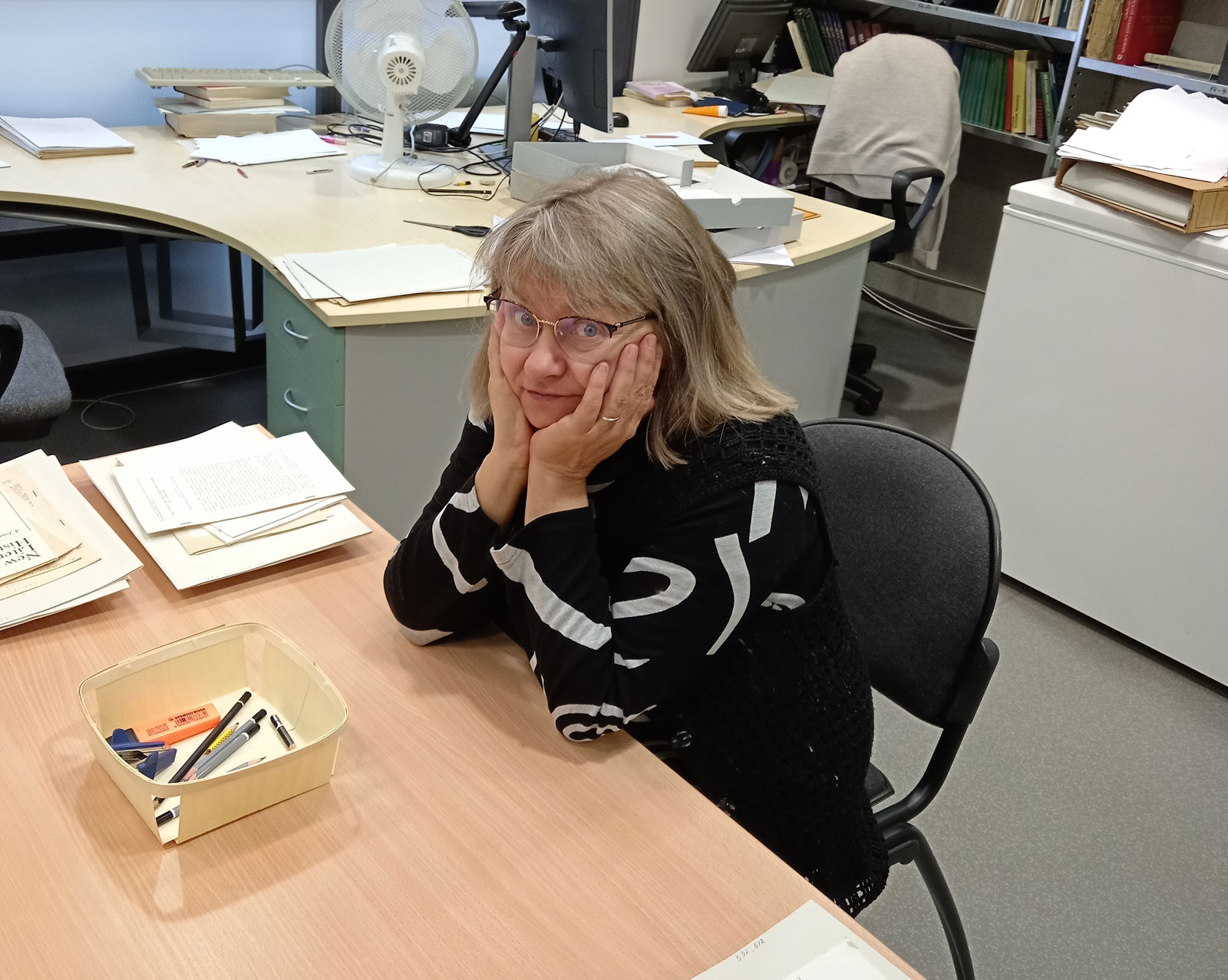 Прежде всего, хочу сказать, что нам очень повезло с директором. У нас сложился, как мне кажется, очень хороший коллектив. Мерит для меня открывает новые миры. У неё большой педагогический талант объяснять непросвещённым и далёким от дигитальных сфер людям разные сложные вещи. На самом деле благодаря развитию технологий открываются потрясающие возможности, в том числе и для архивистов. Если мы заложим все материалы в этот дигитальный мир, то, может быть, искусственный интеллект поможет найти, к каким работам относятся неопознанные фрагменты текстов.