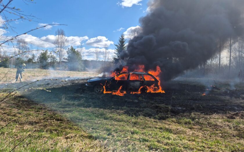 18 апреля в 12:29 спасатели выехали в деревню Пинди волости Выру, где на поле горел легковой автомобиль и сухая трава вокруг него (на фото). Возгорание произошло во время езды по полю, пострадавших нет. К моменту прибытия спасателей автомобиль почти полностью сгорел. Пожар ликвидирован к 13:00.