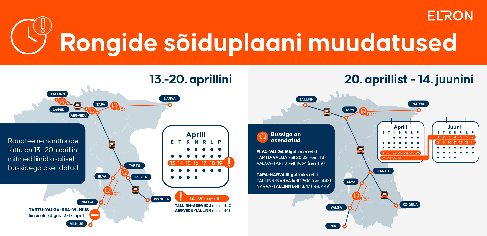 Все рейсы южного и восточного направлений (Таллинн–Тапа, Таллинн–Тарту, Таллинн–Раквере, Таллинн–Нарва) на участке Тапа–Аэгвийду будут обслуживаться автобусами вместо поездов. Также последний рейс Таллинн–Нарва (отправление в 19:06, рейс 448) и Нарва–Таллинн (отправление автобусом в 18:27, рейс 23/19) будет обслуживаться автобусом на участке Аэгвийду–Нарва.