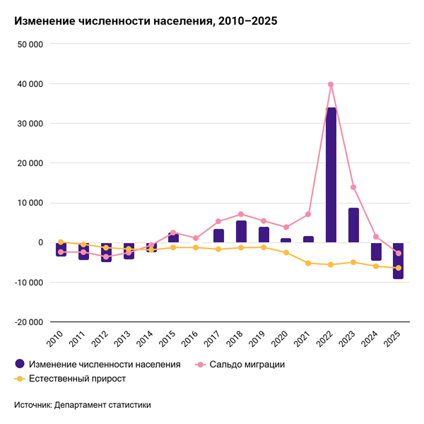 По словам руководителя услуги статистики населения и образования Департамента статистики Кадри Рооталу, две трети от сокращения численности населения составил отрицательный естественный прирост, одну треть — ставшее отрицательным сальдо миграции. «Сальдо миграции, в последние годы влиявшее на рост численности населения и компенсировавшее отрицательный естественный прирост, в 2025 году спустя более чем десять лет снова стал отрицательным. Эстонию покинуло на 2802 человека больше, чем сюда прибыло», — сказала она и добавила, что естественный прирост был отрицательным на 6488 человек.