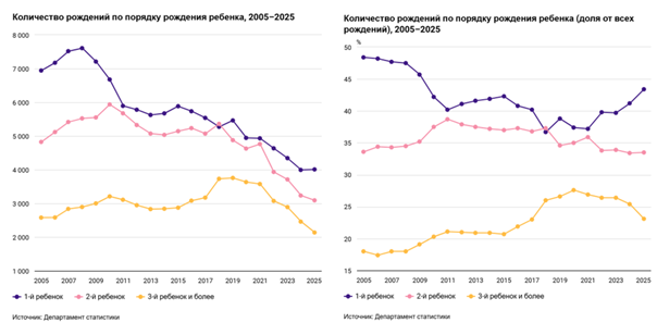 В 2025 году больше всего рождалось первенцев (4010). Вторыми по счету в семье родилось 3092 ребенка, третьими и последующими — 2138. Количественно первенцев родилось несколько больше, чем в прошлом году, вторых и третьих детей родилось меньше. «За последние четыре года заметно увеличилась доля первенцев. Если еще в 2021 году первенцы составляли 37% от всех рождений, то в 2025 году этот показатель уже близился к 43%. Начиная с 2021 года первенцев рождалось на 19% меньше, вторых детей на 35% меньше, а третьих (или последующих) на 40% меньше», — пояснила Рооталу.