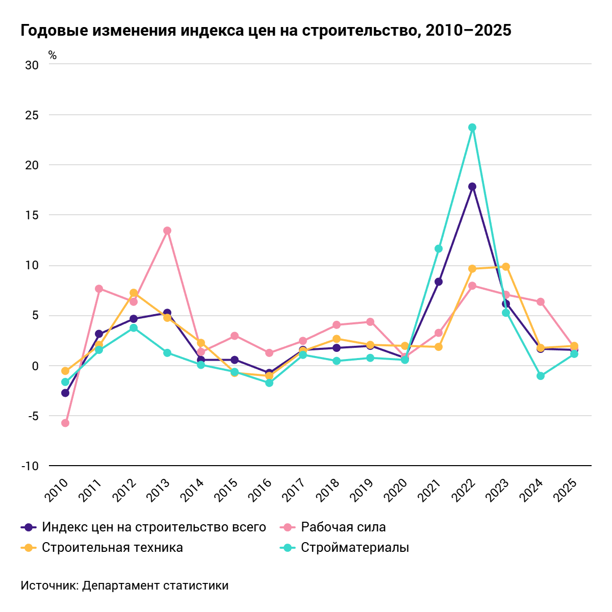 По данным Департамента статистики, индекс цен на строительство, отражающий изменение стоимости строительной деятельности, повысился в 2025 году по сравнению со средним показателем 2024 года на 1,5%. Более всего на рост индекса повлияло повышение цен на материалы.