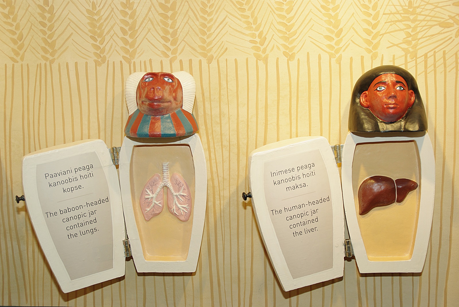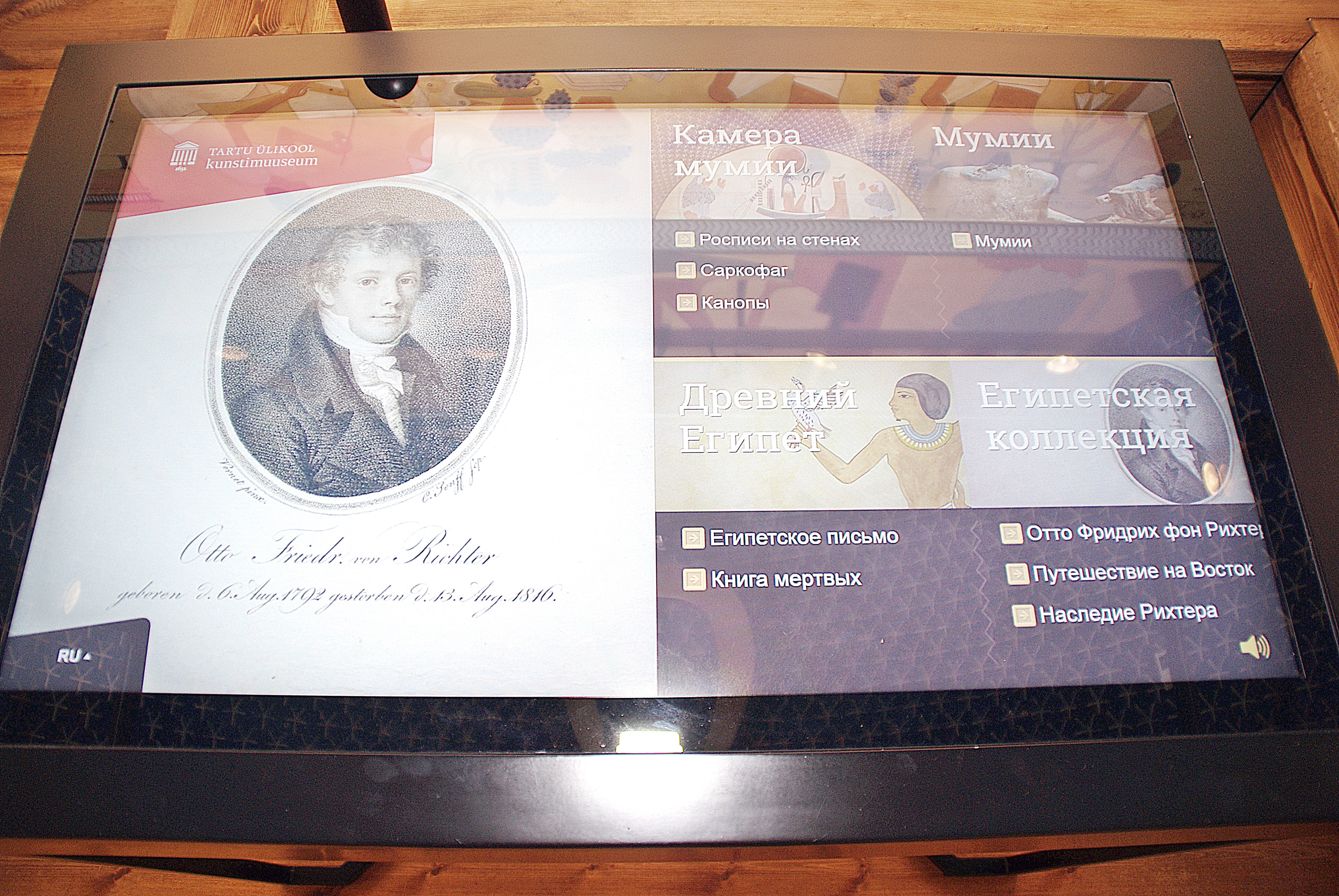 В Художественном музее Тартуского университета хранятся уникальные экспонаты, привезённые в Эстонию из научных экспедиций учёным-востоковедом О.Ф. фон Рихтером. Речь идёт о двух единственных в нашей стране целостных египетских мумиях человека. В собрании музея имеются также забальзамированное животное из семейства собачьих и глиняный сосуд, как ранее считалось, в нём находится мумия священной у древних египтян птицы ибис. Однако после сделанного в 2013 году радиологического анализа сотрудников музея ждало разочарование: оказалось, что якобы забальзамированный ибис – всего лишь искусная древняя подделка. Тогда же выяснился примерный возраст человеческих мумий – мальчику на момент смерти было от двух до четырёх лет, подростку – от девяти до четырнадцати. У обеих мумий забальзамированные органы помещены обратно в брюшную полость, что даёт основание предположить, что жили они за 700 лет до нашей эры. До этого времени внутренние органы усопшего хранились в канопах, то есть в ритуальных сосудах (как правило, в алебастровых кувшинах с крышкой в форме человеческой или звериной головы, в зависимости от того, какой человеческий орган в них помещали).