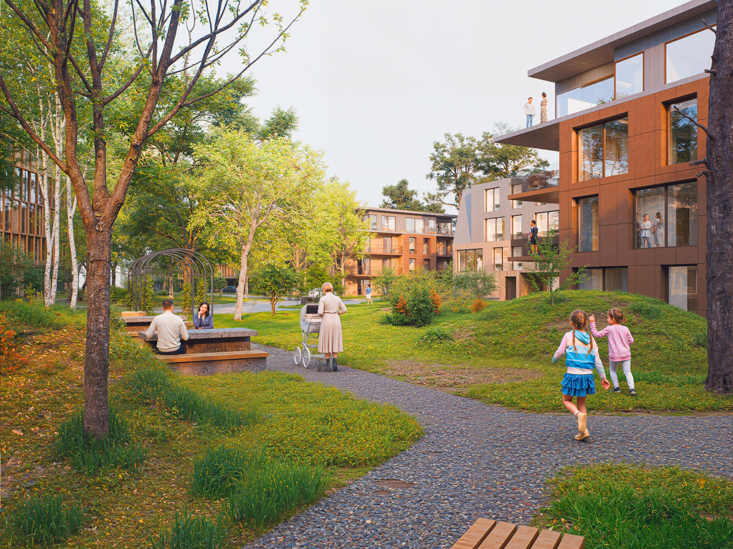 Алвер также отмечает тесную связь жилых пространств с уличной средой: «Все квартиры получают сильную связь с внешним пространством — через просторные террасы или крытые балконы. Непрерывный уличный коридор проходит между зданиями, создавая виды и пешеходные связи. В промежутках между домами разместятся игровые площадки, зоны для пикников, уличные тренажёры или общественные теплицы».