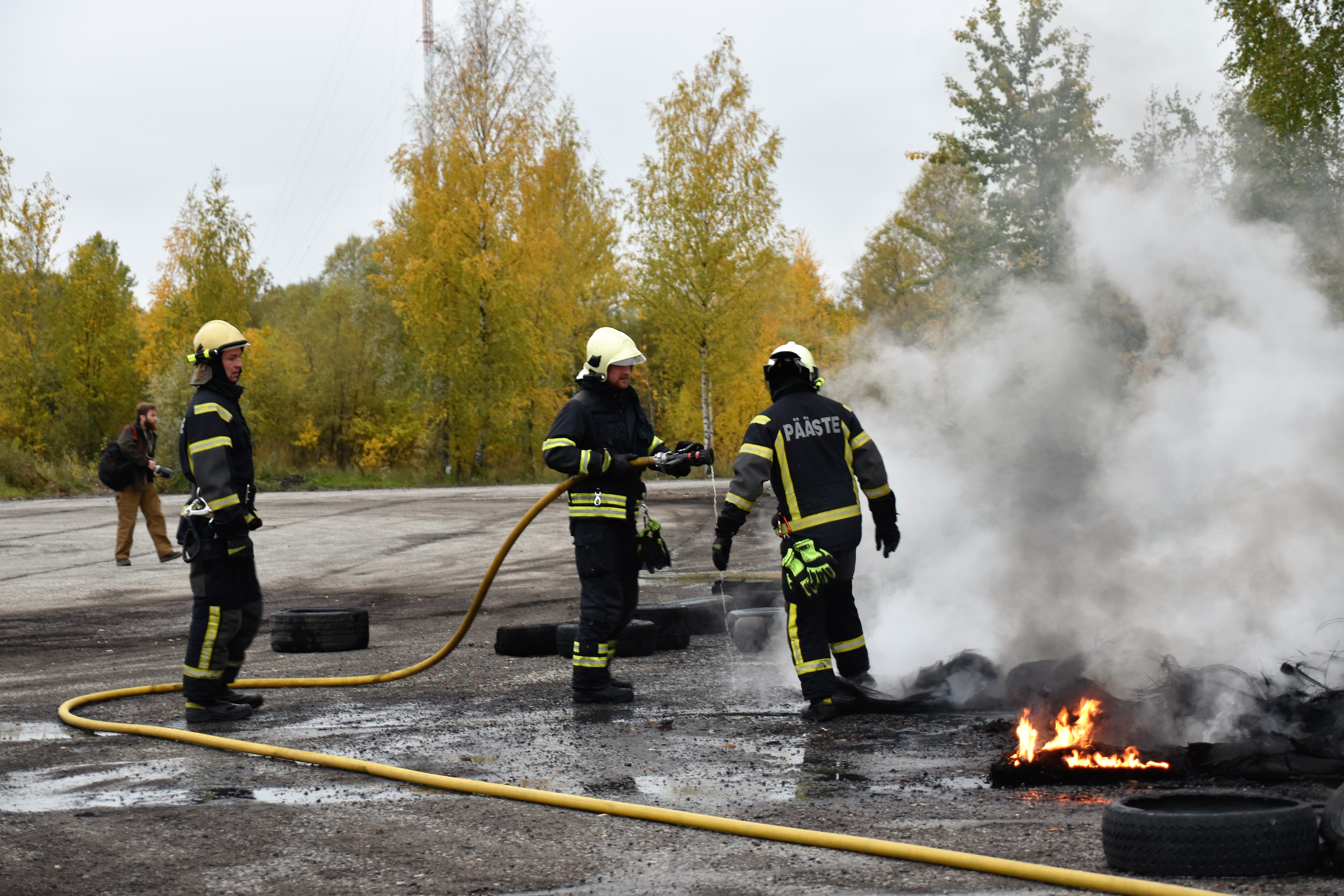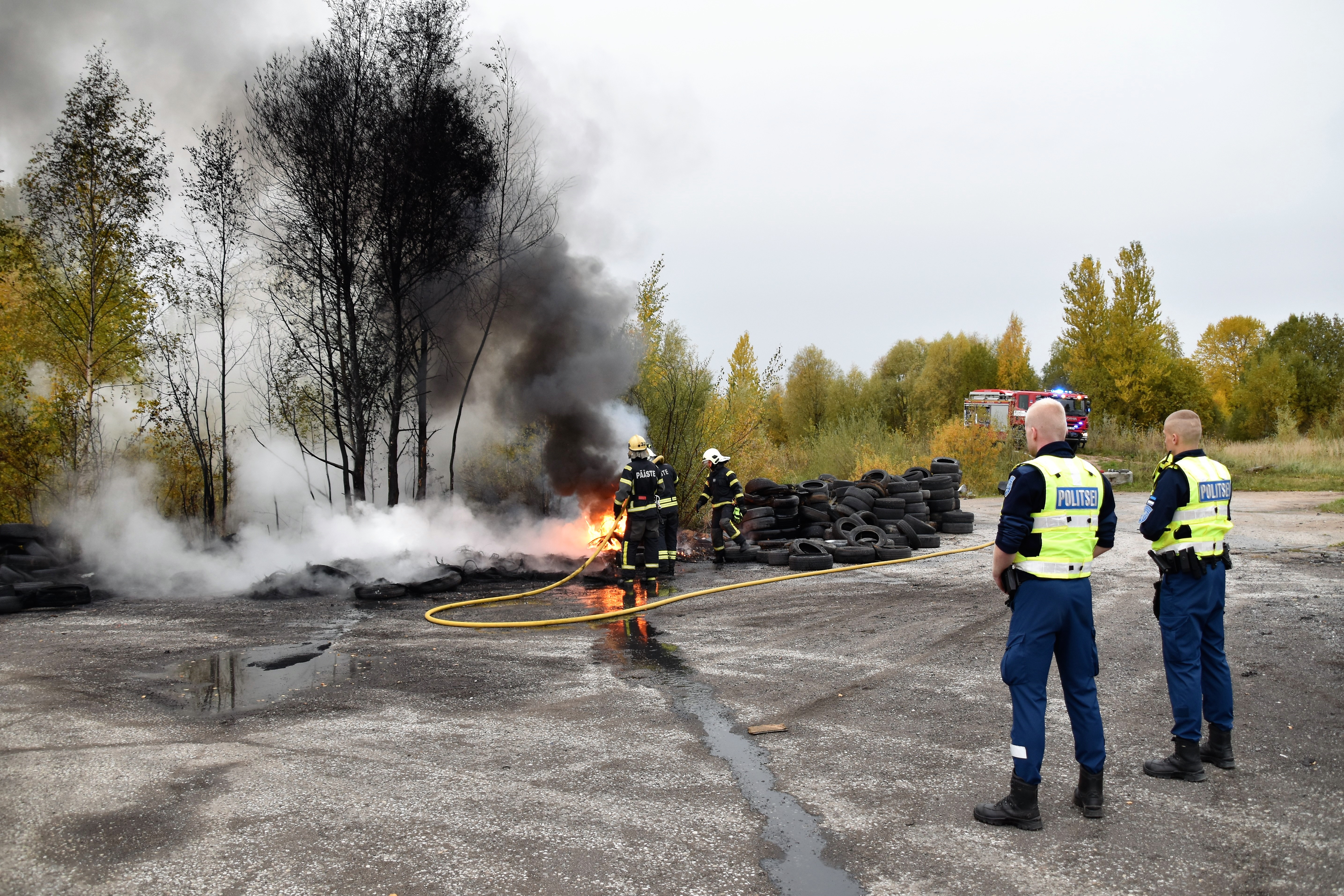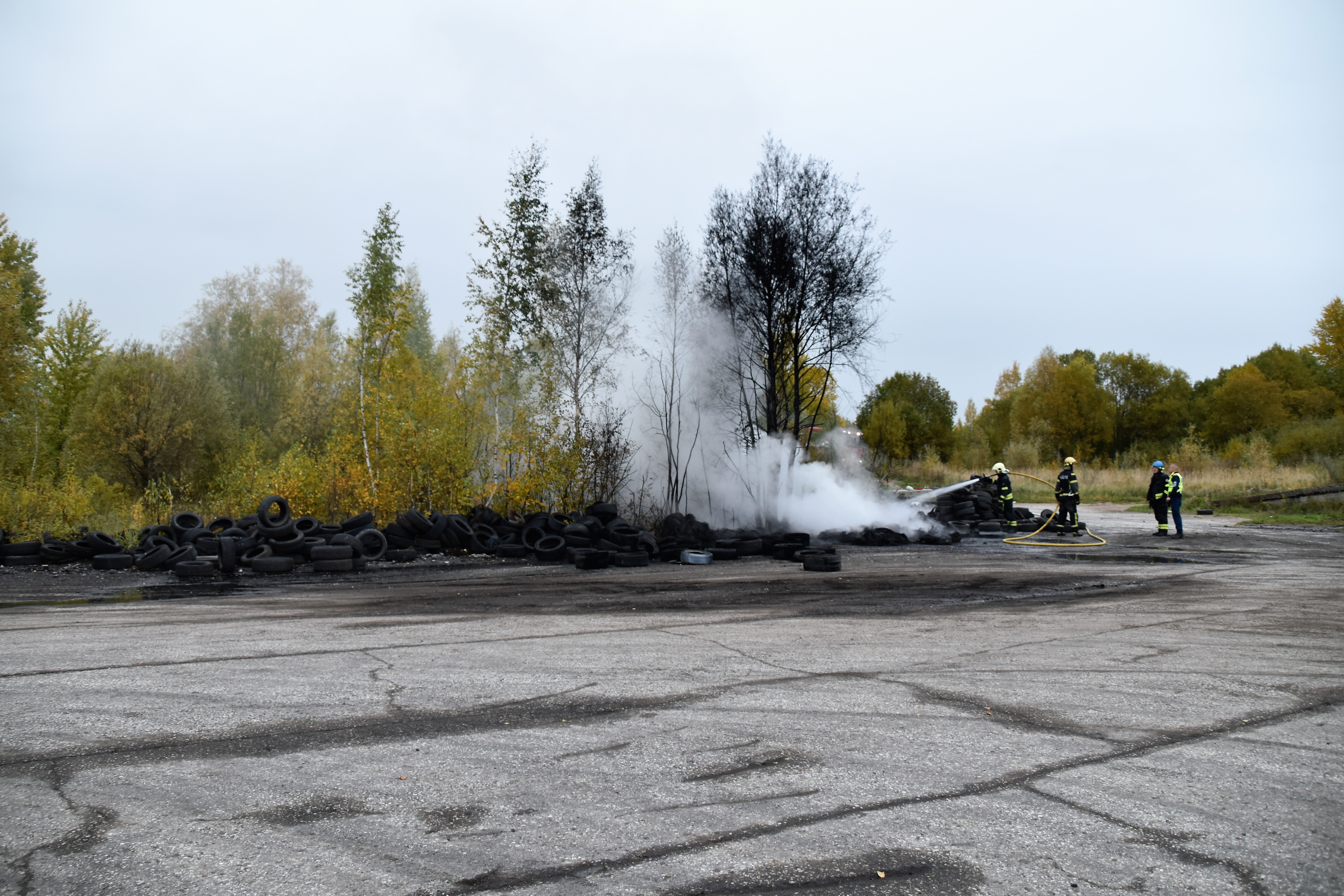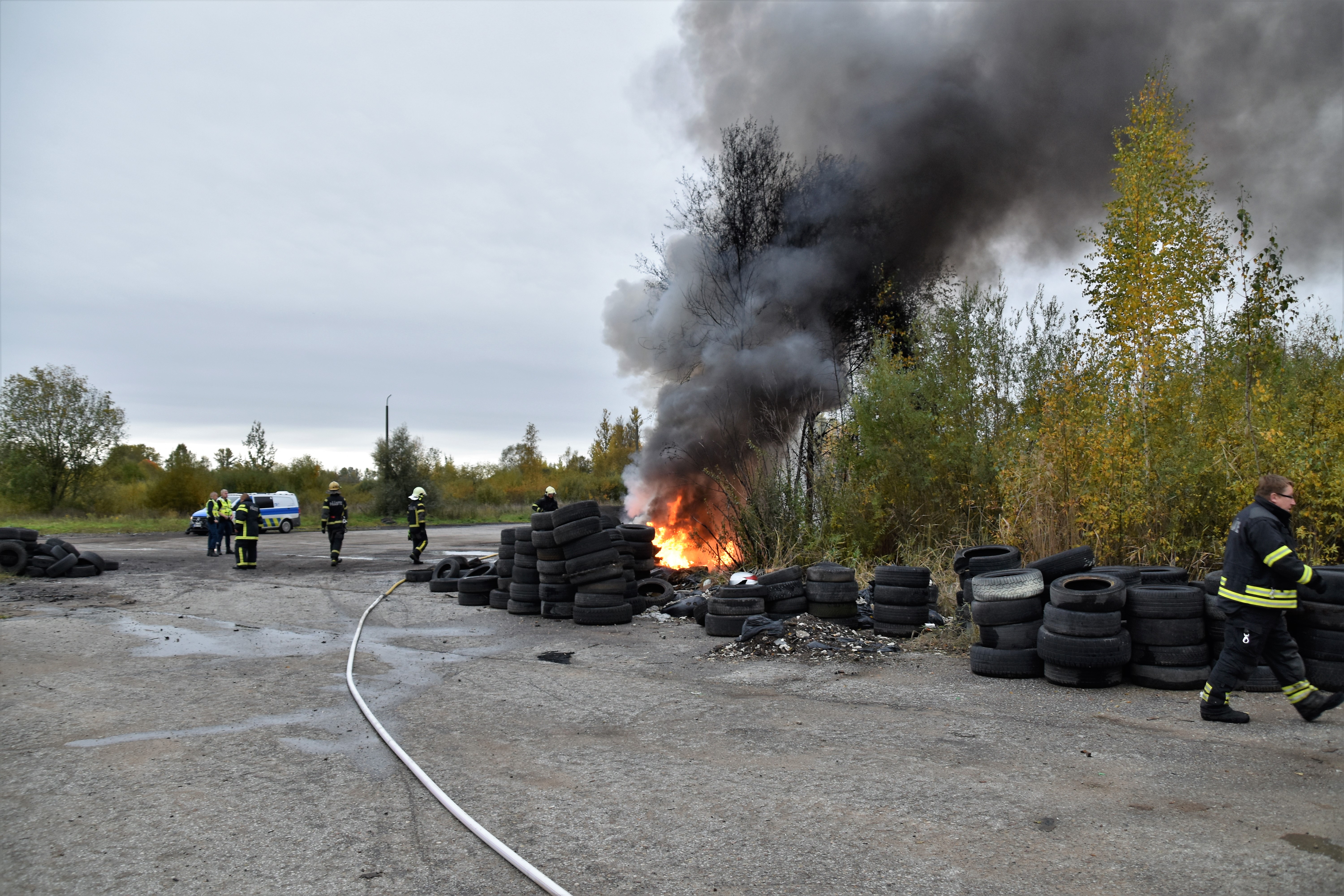 Выброшенные использованные покрышки загорелись или же были подожжены. В том же районе и раньше покрышки загорались «сами по себе». Погода была дождливой, облачной. Кто мог поджечь покрышки, полиция мне сообщить не смогла. Кроме того, неизвестно, кому они принадлежат. Однако работу спасателей осложнили бетонные блоки, которые были установлены на дороге и заблокировали подъезд к месту происшествия. Последний очаг возгорания был локализован и потушен в 9.31.