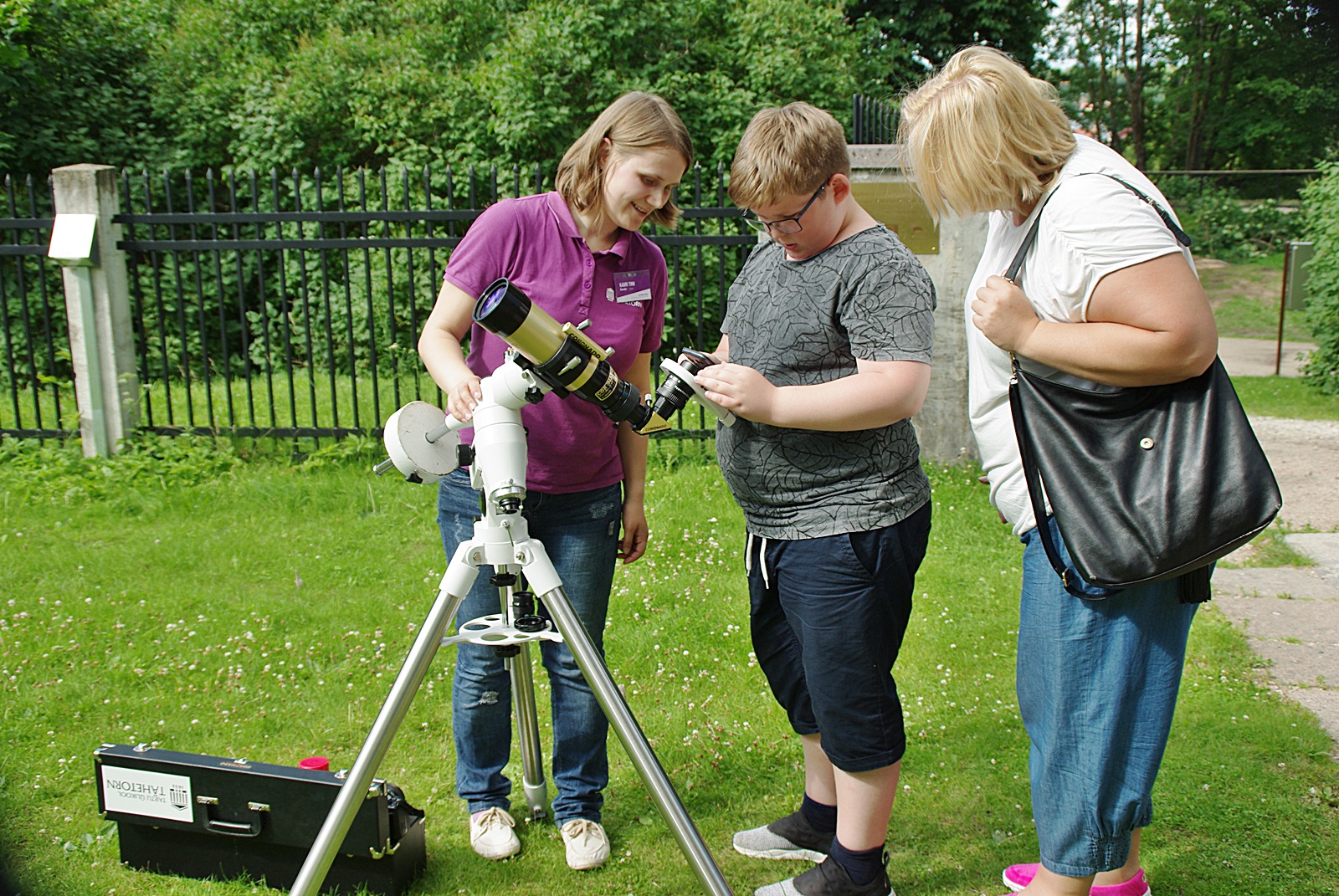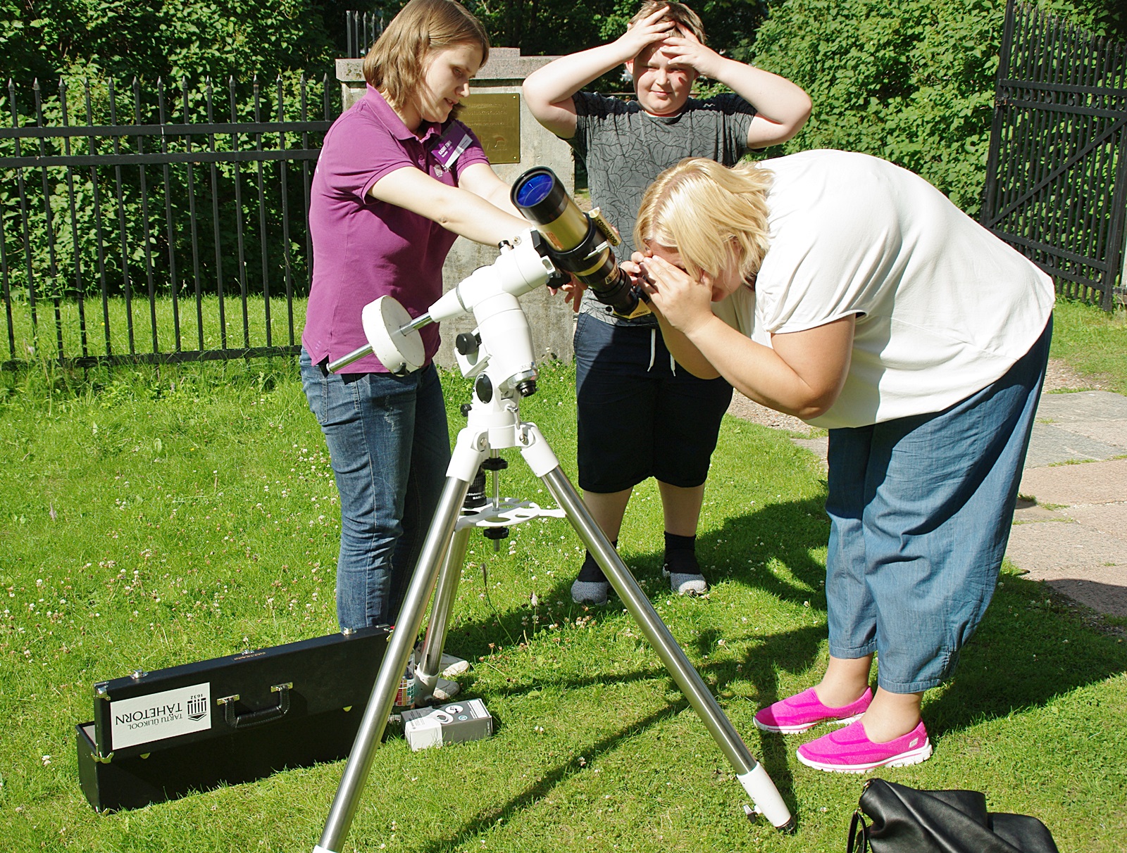 В дворе исторической обсерватории посетителям показывают, как обращаться с телескопом Coronado SolarMax II, с помощью которого можно увидеть Солнце во всей его красе – в виде красного диска, а особенно терпеливые и внимательные разглядят на нём и солнечные пятна, а то и протуберанцы – огненные языки раскалённого газа, вьющиеся вокруг яркого диска. Телескоп оснащён светофильтрами, которые надёжно защищают наши глаза. Невооружённым глазом на звезду по имени Солнце смотреть опасно. А тут не только посмотреть, но, возможно, даже сфотографировать Солнце с помощью смартфона получится.